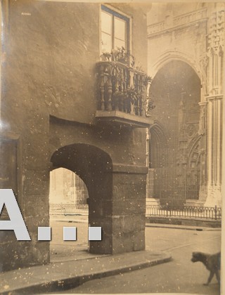 En la segunda de las fotos vemos una puerta lateral de la Catedral de Oviedo tapada la visión por una casa con soportales que no existe hoy día. Aqui la escena esta potenciada, en su soledad, por la imagen del perro paseando cortado por el borde de la foto.
