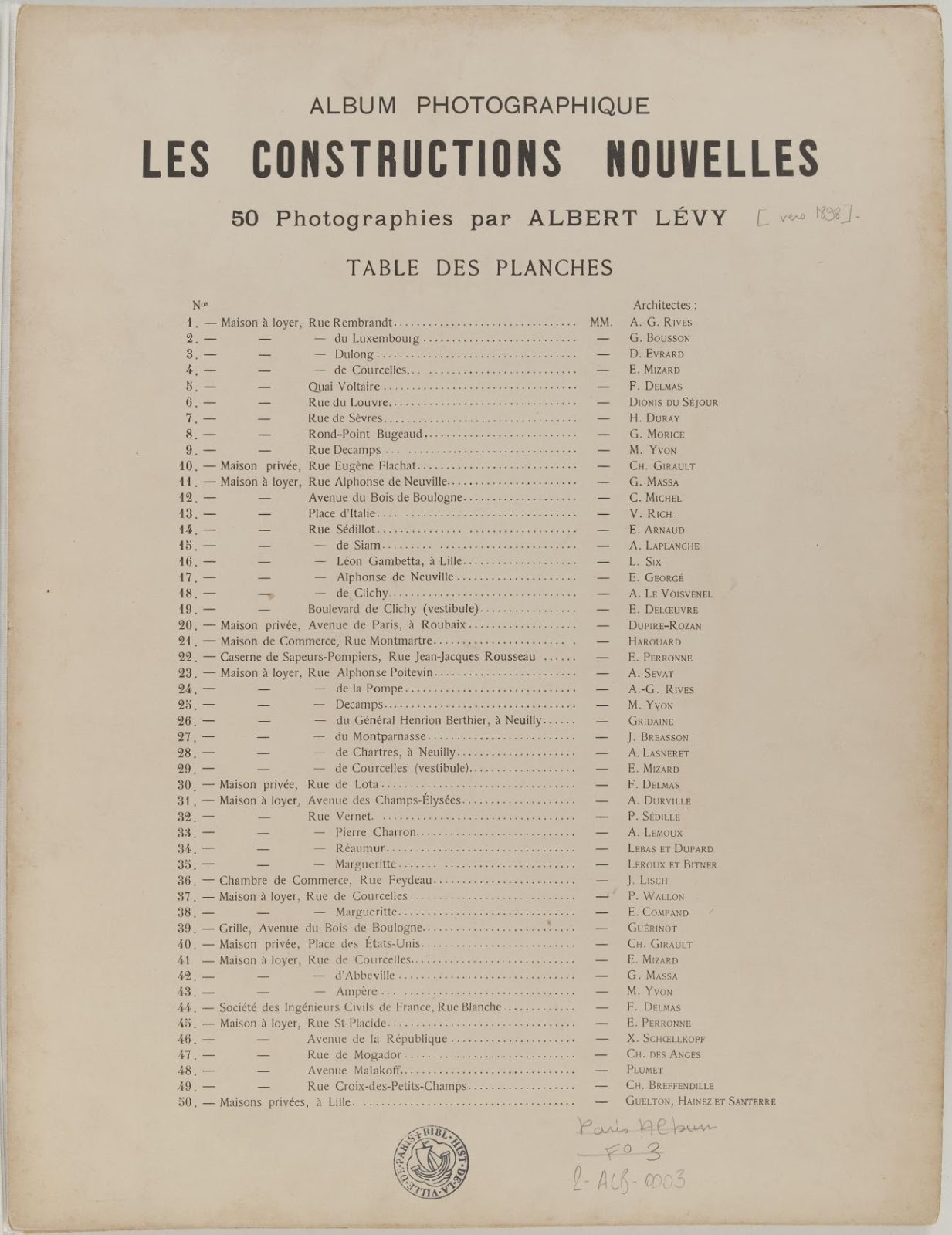 Titre(s) Les Constructions nouvelles. 50 photographies : [photographie] / par Albert Lévy Auteur(s) Lévy, Albert (1847-1905 ?) [Photographe] [21] Editeur(s), Imprimeur(s) [1898] [4] Description 50 cyanotypes dans un album ; 24 x 29 cm Cote de l'exemplaire numérisé 2-ALB-0003 Date de mise en ligne 11/08/2016 Droits d'accès Consultable sans restrictions Droits domaine public Source Ville de Paris / BHVP / Roger-Viollet Élément(s) numérisé(s) 51 http://bibliotheques-specialisees.paris.fr/ark:/73873/pf0001945647/v0001.simple.highlight=Createur:%20%22L%C3%A9vy,%20Albert%20(1847-1905%20.selectedTab=thumbnail